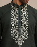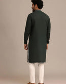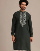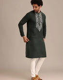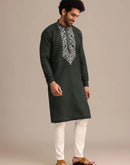 Bottle Green Linen Kurta And Pant Set With Floral Resham Elegant Designer Kurta Sets