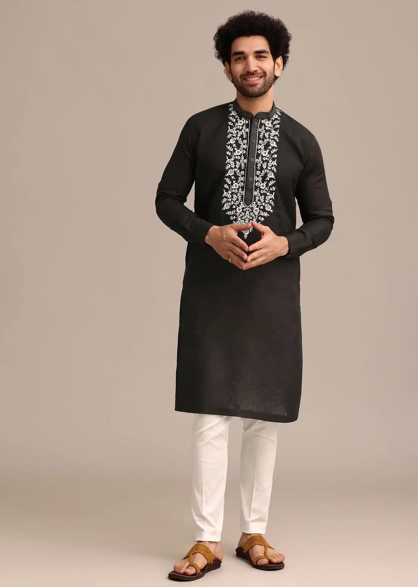 Product Speciality: This Black Linen Floral Resham Work Kurta Set boasts a timeless elegance that seamlessly blends traditional and modern aesthetics. Perfect for festive occasions, weddings, or casual outings, this male kurta set is a staple for any stylish wardrobe. Crafted from quality linen, the kurta set is comfortable to wear and easy to maintain. The standout feature is its sophisticated Resham embroidery, which adds an exquisite touch of charm and luxury to the attire. Its black color brings a universal appeal that suits all skin tones. Awarded as the Most Trusted Brand, we deliver styles as promised.