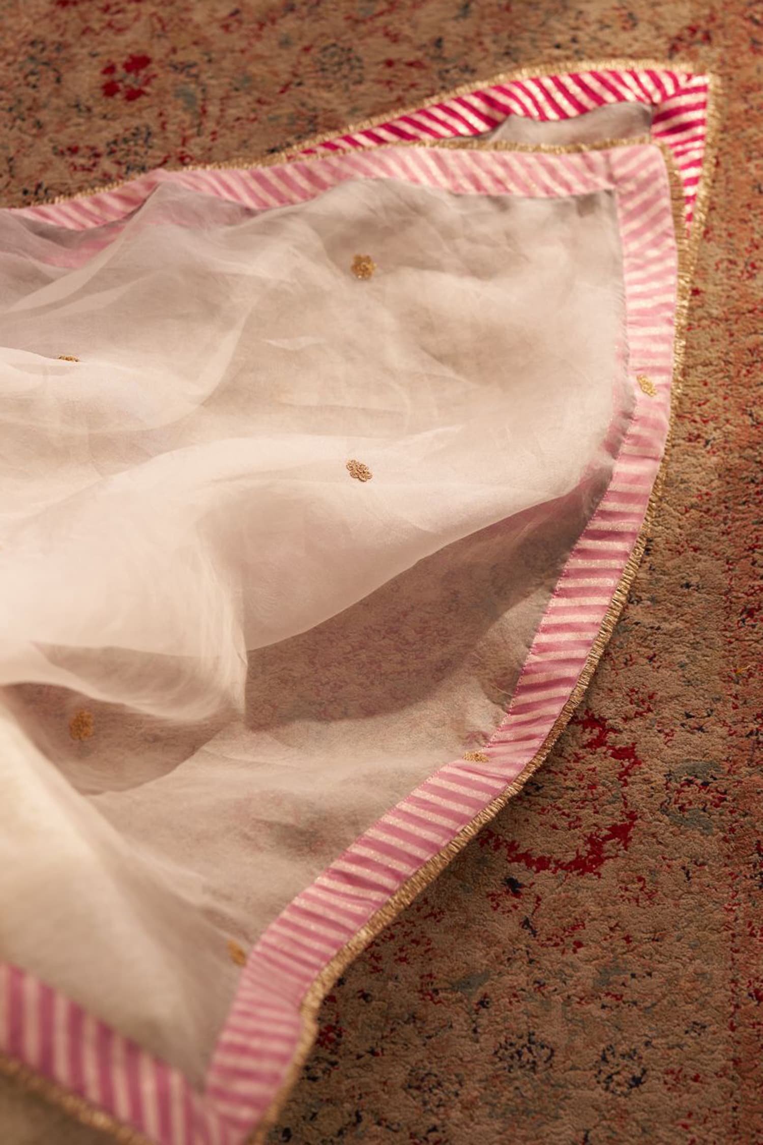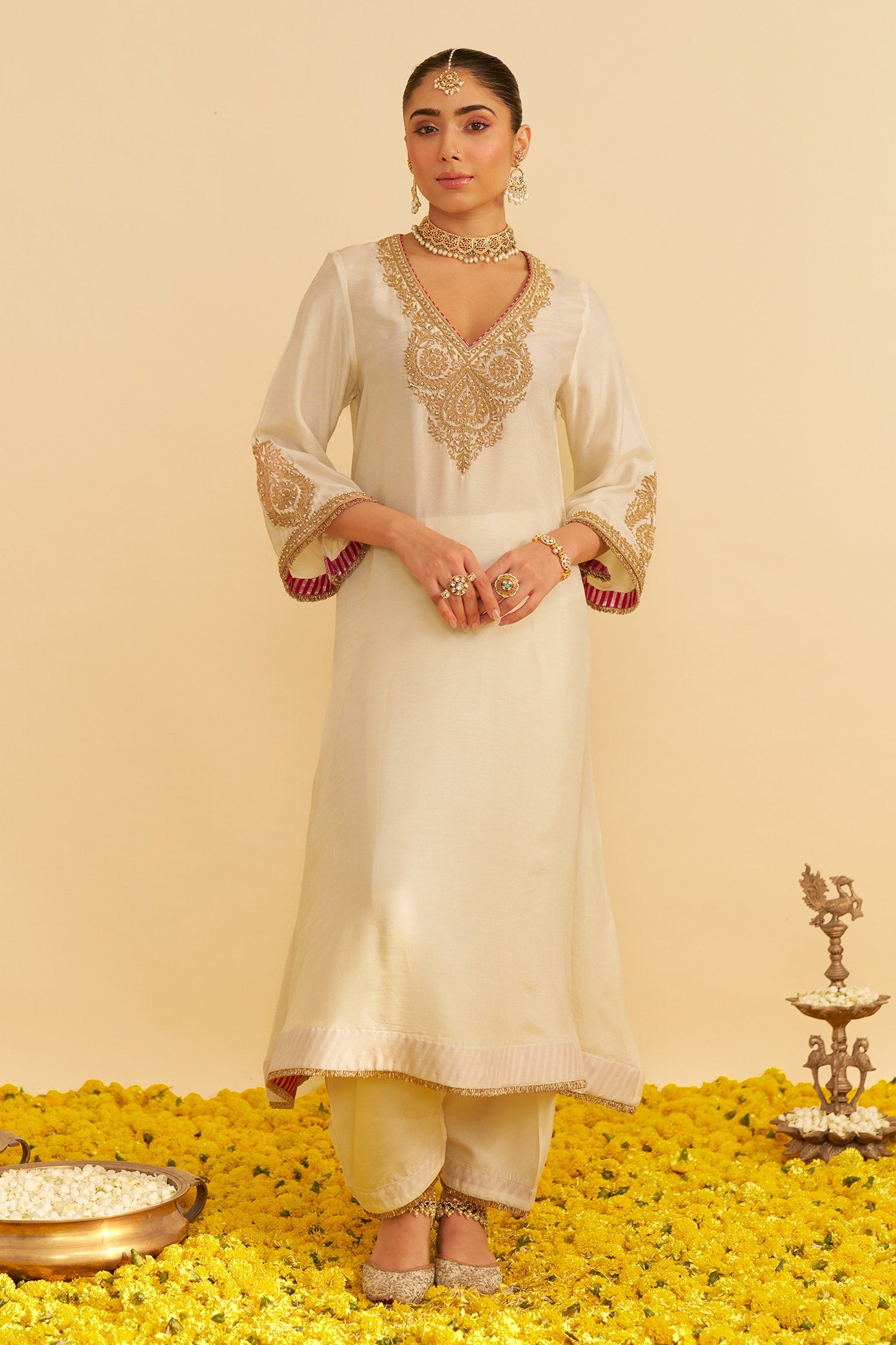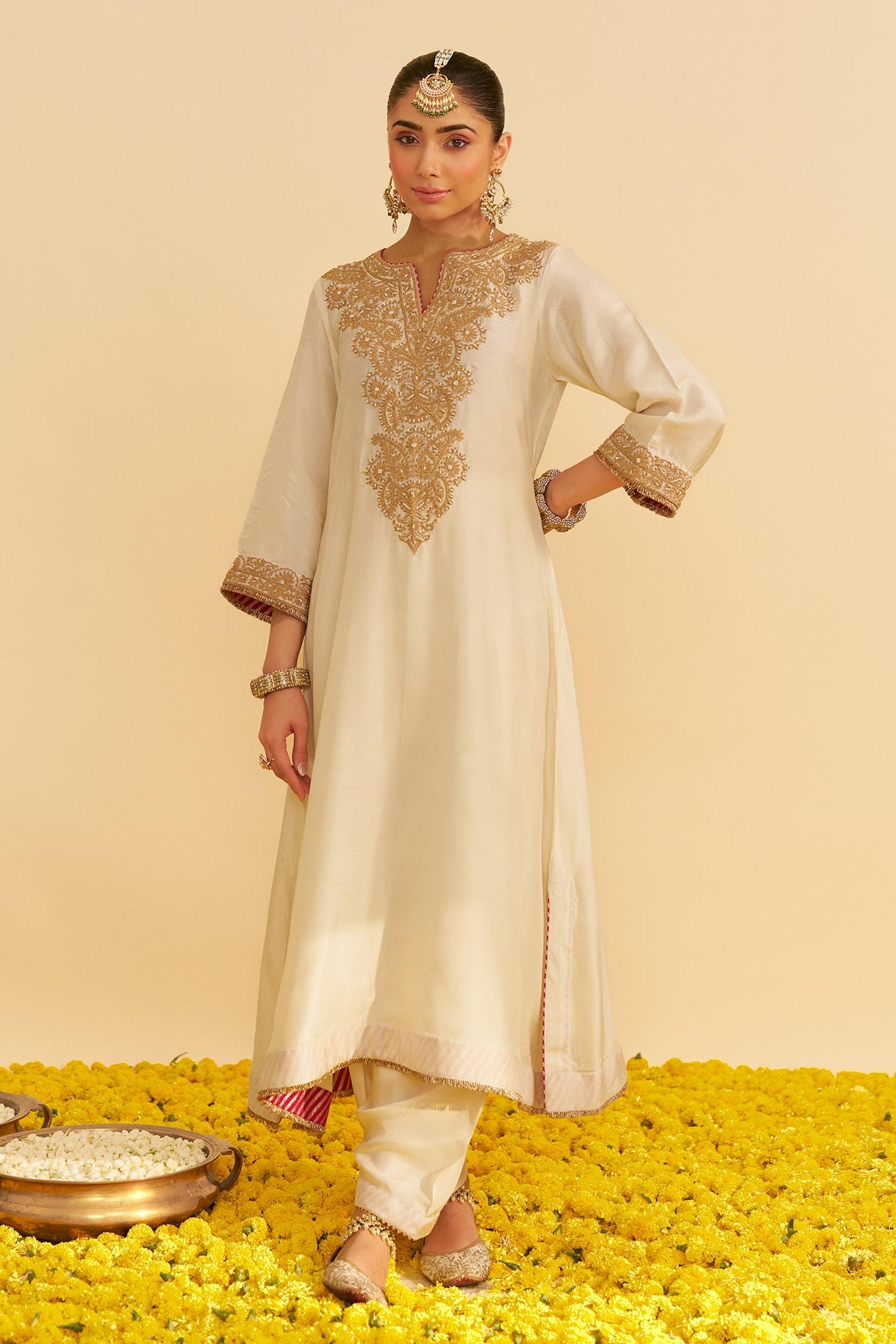 Intricate gold embroidery along the neckline and cuffs., Contrast red detailing on the salwar.